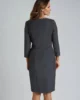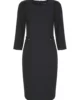 Sukienka o formie dopasowanej do sylwetki wyszczuplającymi cięciami. Po bokach do linii talii wszyte czarne panele. Dekolt z wyciętą literą V ozdobioną metalową dekoracją. Na linii talii paseczki ozdobione małymi, metalowymi obręczami. Rękaw ¾ z zaszewką. Zapinana z tyłu na suwak. Sukienka na podszewce.