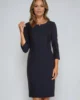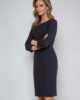 Kobieca, elegancka granatowa sukienka z rękawem 3/4 i kontrastowymi wstawkami w kolorze czarnym. Boczne cięcia i wstawki optycznie wyszczuplają sylwetkę. Sukienka uszyta została z grubej tkaniny, która nie podkreśla boczków, a dobrze trzyma sylwetkę. W składzie materiału jest wiskoza, dzięki czemu jest on miły w dotyku. Półokrągły dekolt rozcięciem i wszytą ozdobną klamerką. Z tyłu rozporek ułatwiający poruszanie się. Lubisz granatowe sukienki? Zajrzyj na nasz profil na Instagramie. Jeśli szukasz innych klasycznych żakietów polecamy zajrzeć do naszego sklepu internetowego do kategorii sukienki do pracy.