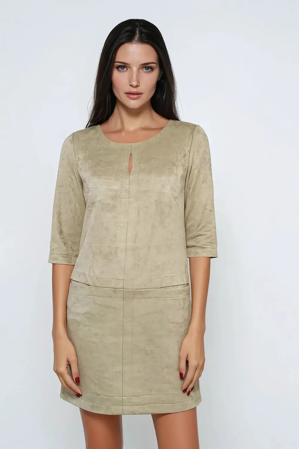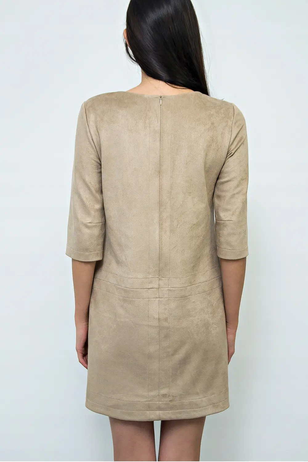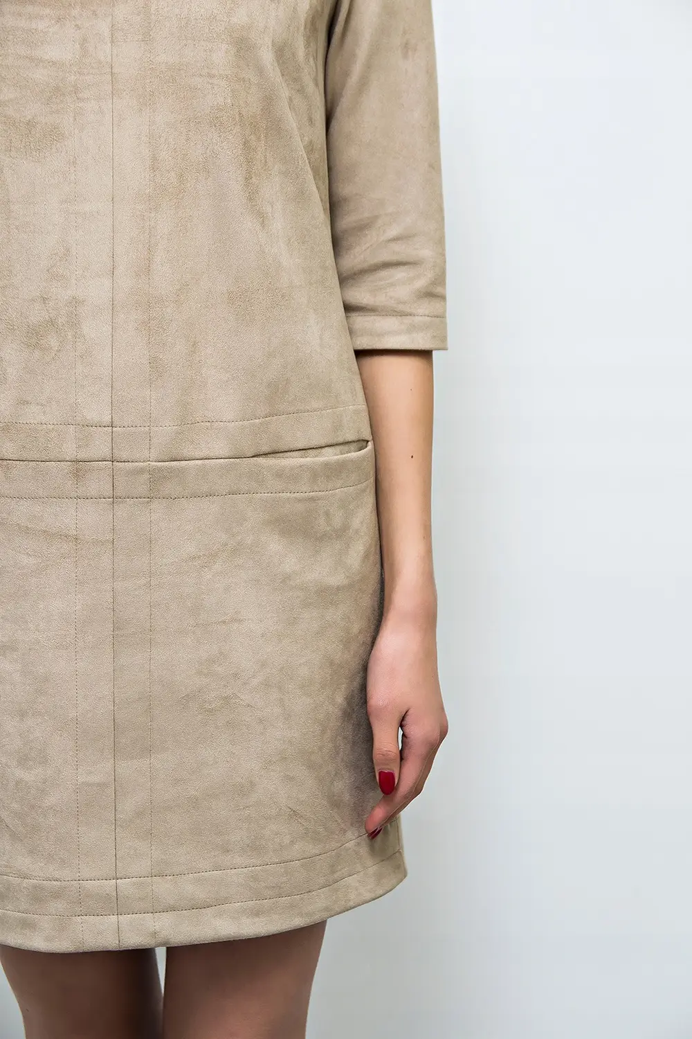 Beżowa sukienka z miękkiego, sztucznego zamszu. Prosty fason, lekko dopasowany do sylwetki skośnymi cięciami gorsu. Wzdłuż przodu i linii bioder ostebnowane cięcia,w które wszyto dwie kieszenie. Zapinana z tyłu na suwak.
