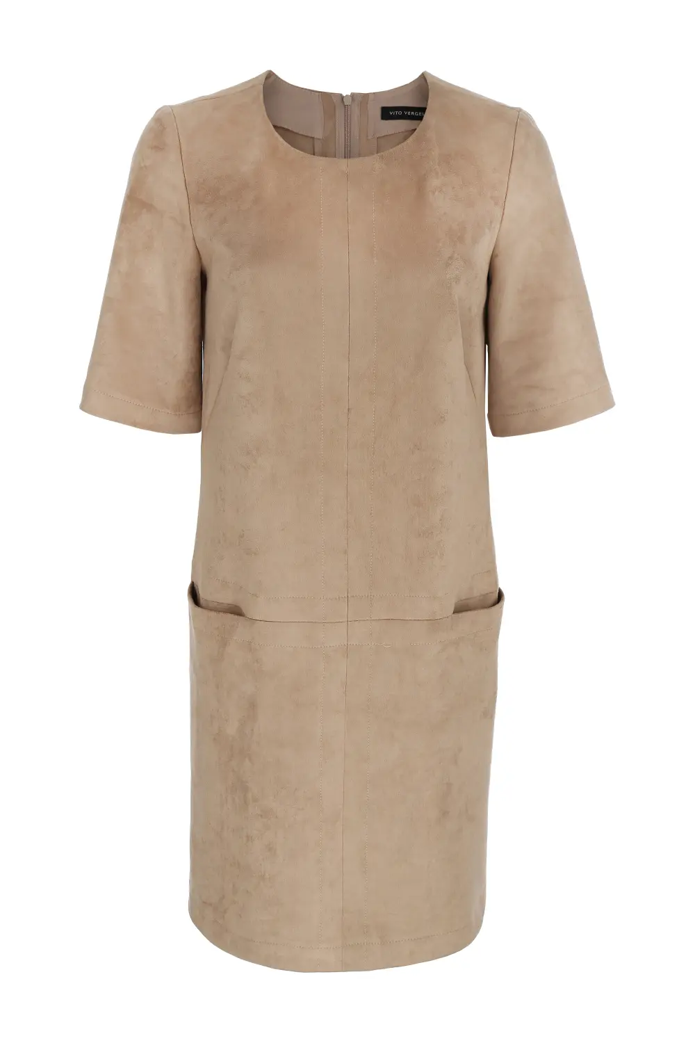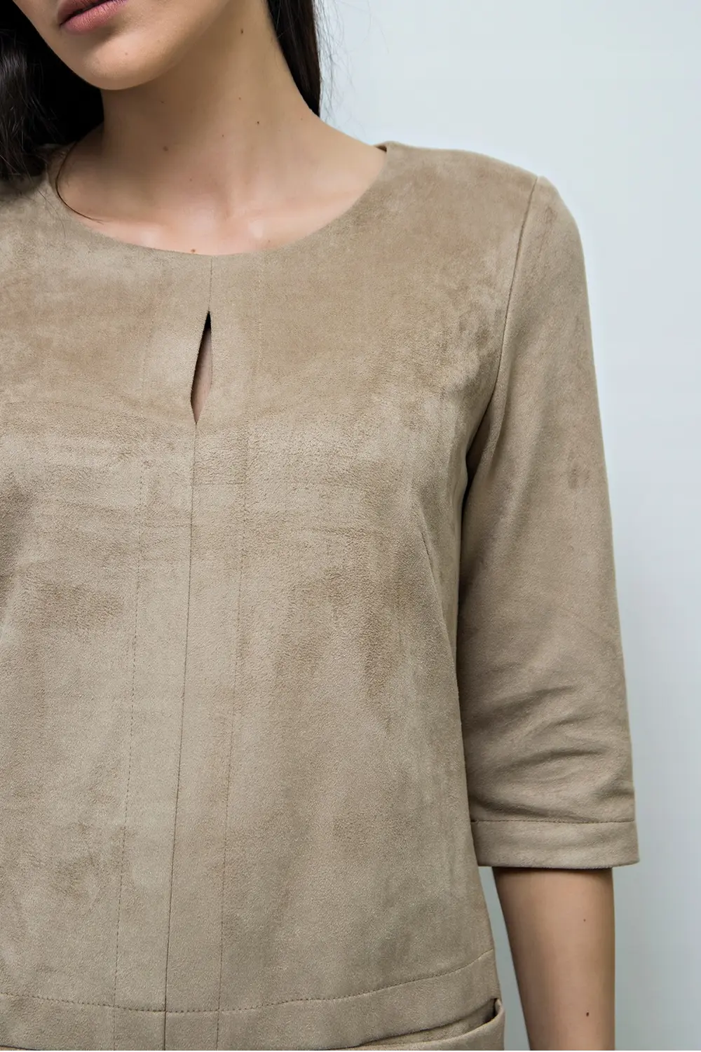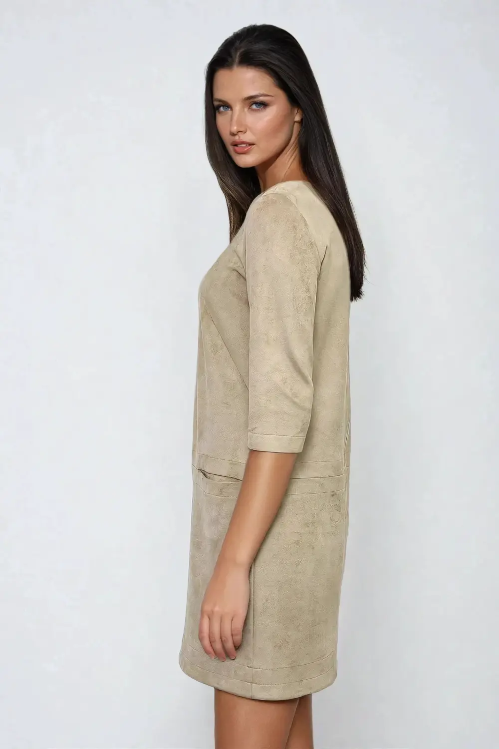 Jesienna sukienka z miękkiego zamszu w kolorze beżowym.