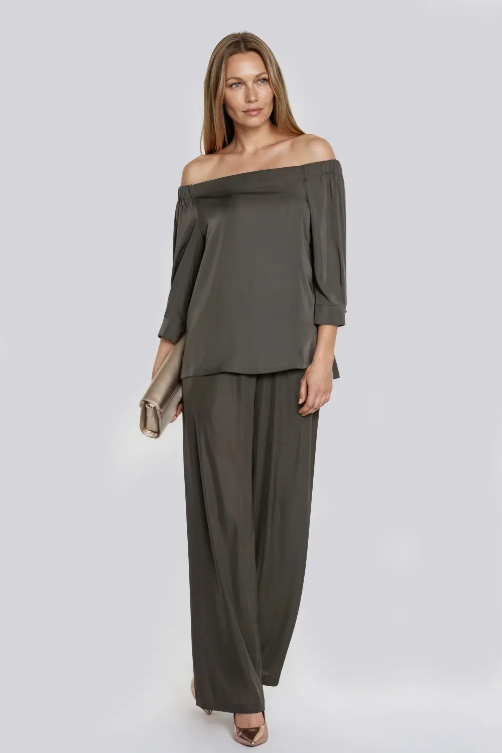 Oliwkowa bluzka idealna na lato, jak i na inne pory roku. Noś ją ze spodenkami, długą spódnicą lub szerokimi spodniami od kompletu. Razem z szerokimi spodniami w tym samym kolorze tworzy wizytowy komplet damski. Lekki połysk sprawia, że idealnie nadaje się na specjalną okazję. Jeśli szukasz kobiecych bluzek na różne okazje, to zajrzyj na nasz profil na Instagramie i do naszego sklepu internetowego do kategorii bluzki damskie lub kategorii dekolt carmen. Znajdziesz tam sukienki i bluzki z odkrytymi ramionami.