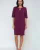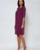 Luźna sukienka pudełkowa z półokrągłym dekoltem z wyciętą łezką i aplikacją. Przód cięty przez środek, z tyłu na całej długości suwak. Rękaw opadający, kimonowy z wstawianym klinem wykończonym trójkątem. Sukienka na podszewce.