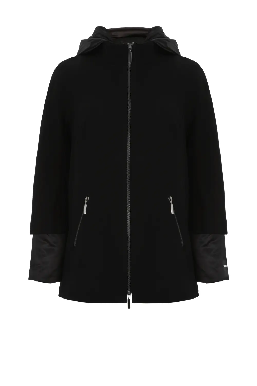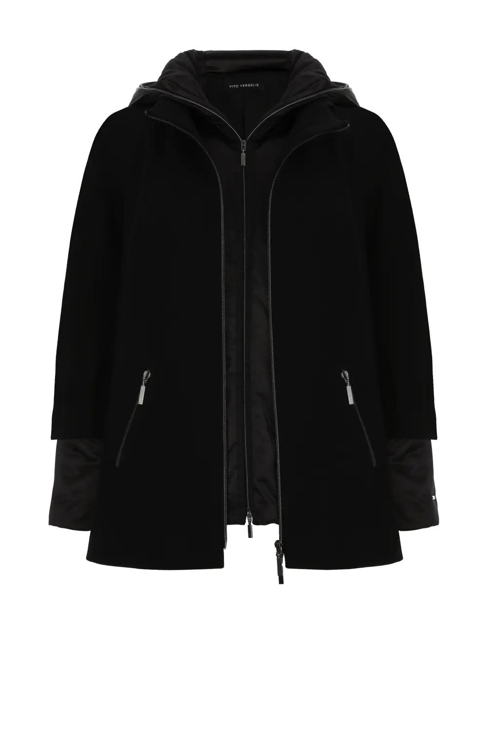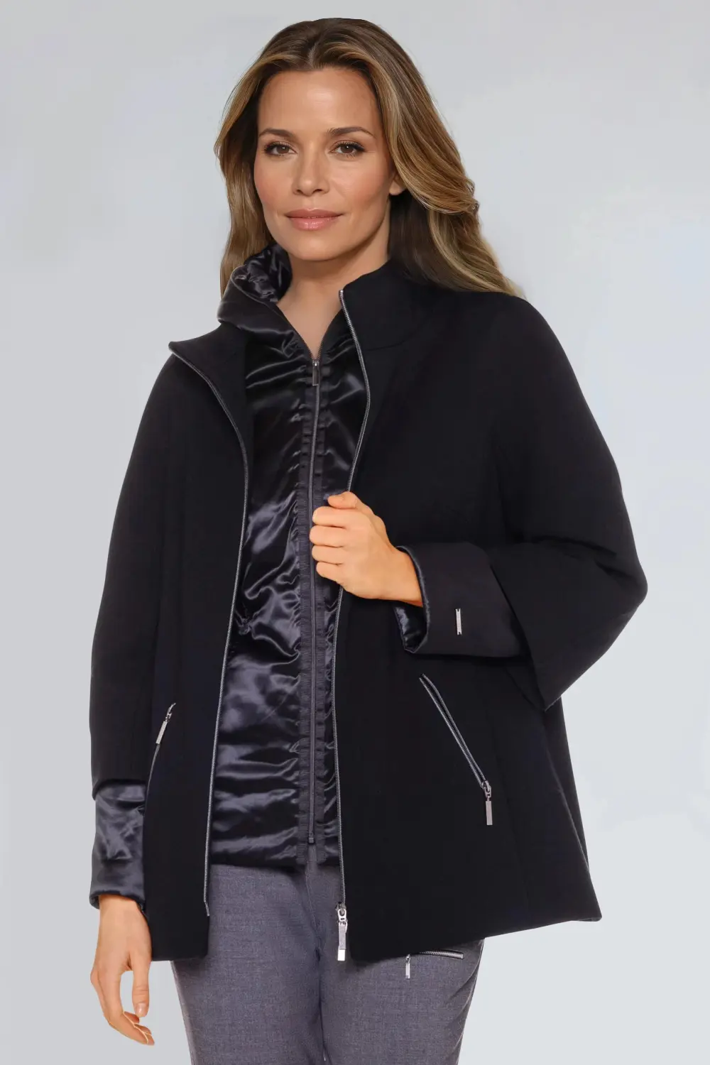 Dwuczęściowa kurtka damska wełniana i puchowa. Obie można nosić oddzielnie. Wierzchnia, wełniana kurtka damska ma obszerny krój z szerokim rękawem kimono o długości 3/4, stójką i ukośnymi kieszeniami wykończonymi suwakami. Wewnętrzna kurtka puchowa damska z kapturem uszyta z cienkiej tkaniny technicznej na piance jest delikatnie dopasowana cięciami pionowymi w przodzie i tyle, zapinana na suwak wszyty do końca kaptura. Ma dwie kieszenie. Całość na wiskozowej podszewce.