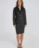 Klasyczna, jednorzędowa marynarka z klapami w męskim stylu. Lekko dopasowany krój wcięciem w talii i pionowymi zaszewkami. Zapinana na dwa metalowe guziki. Na bokach ma dwie kieszenie z patkami. W podkrój kołnierza wszyta ozdobna taśma kontrastowa. Uszyta z grubej, miękkiej dzianiny w szary prążek.