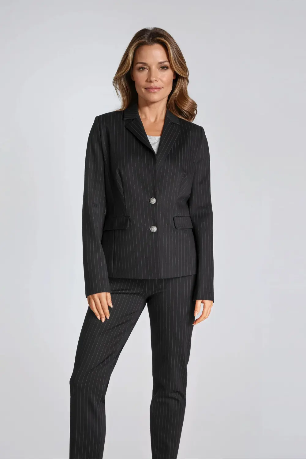 Klasyczna, jednorzędowa marynarka z klapami w męskim stylu. Lekko dopasowany krój wcięciem w talii i pionowymi zaszewkami. Zapinana na dwa metalowe guziki. Na bokach ma dwie kieszenie z patkami. W podkrój kołnierza wszyta ozdobna taśma kontrastowa. Uszyta z grubej, miękkiej dzianiny w szary prążek.