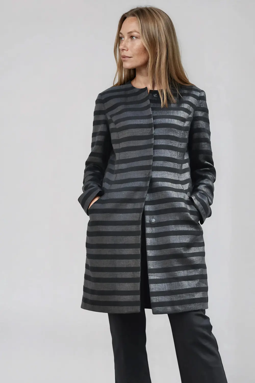 Paski w modzie wracają co kilka sezonów – ale ten typ pasków (delikatne, błyszczące, poziome) to klasyka, która nigdy nie wychodzi z mody. To elegancka, stonowana wersja – taka, która działa od dekad. Za 5 lat ten płaszcz będzie wyglądał równie dobrze jak dziś, bo został zaprojektowany z myślą o ponadczasowości, nie o szybkiej modzie.