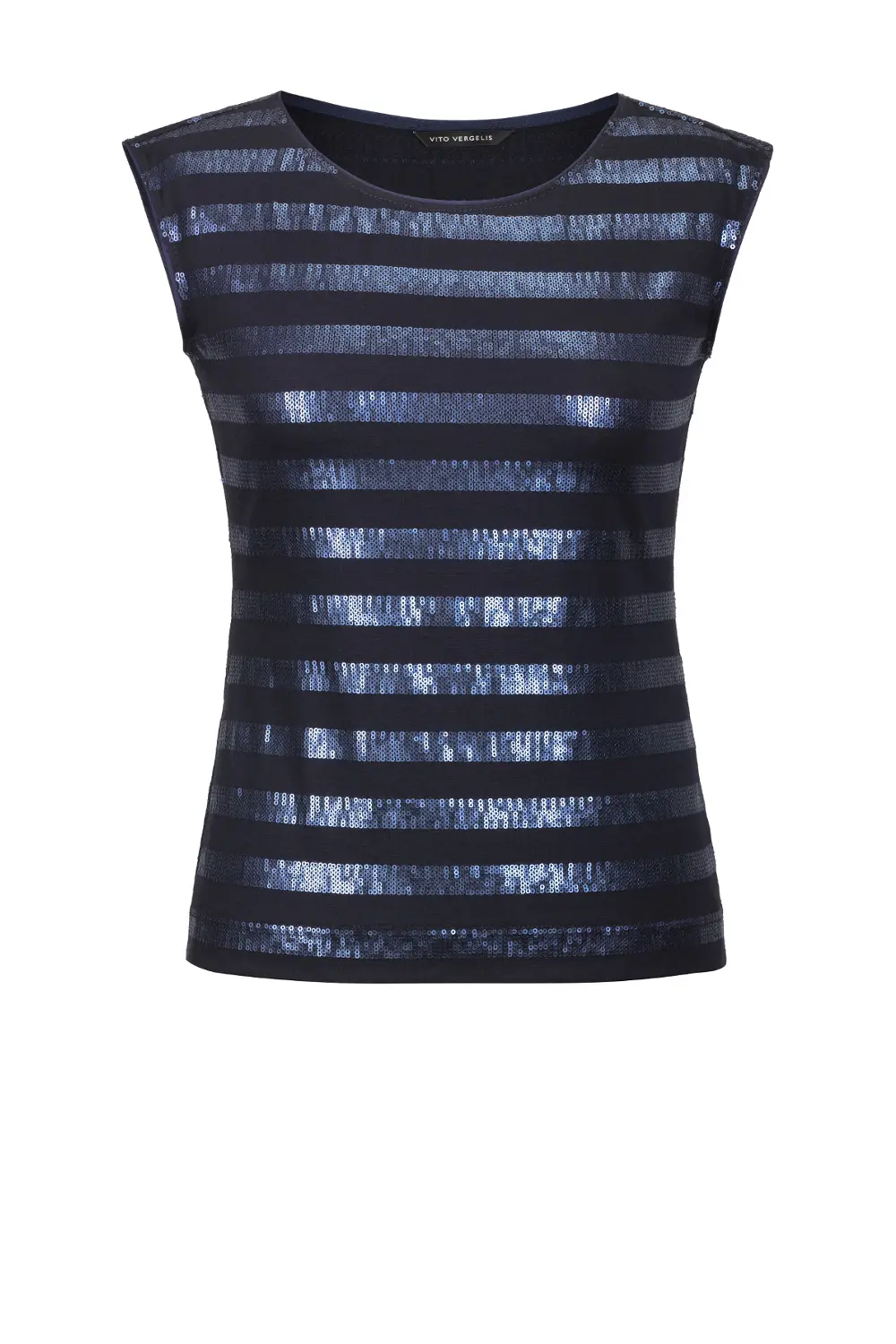 Bluzka bez rękawów z opadającą linią ramienia. Dekolt typu łódka. Uszyta z granatowej wiskozy z paskami z cekinów. Linia dekoltu i rękawów obszyta lamówką. Bluzka podszyta miękkim materiałem, dzięki czemu wygodnie się ją nosi.
