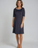Dzianinowa sukienka w kolorze granatowym. Fason odcinany z dopasowaną górą. Dół – rozkloszowany. Zapinany w tyle na kryty zamek. Rękaw długości do łokcia. Dekolt półokrągły. Dekolt i rękawy wykończone ozdobną taśmą ściągaczową. Sukienka bez podszewki.