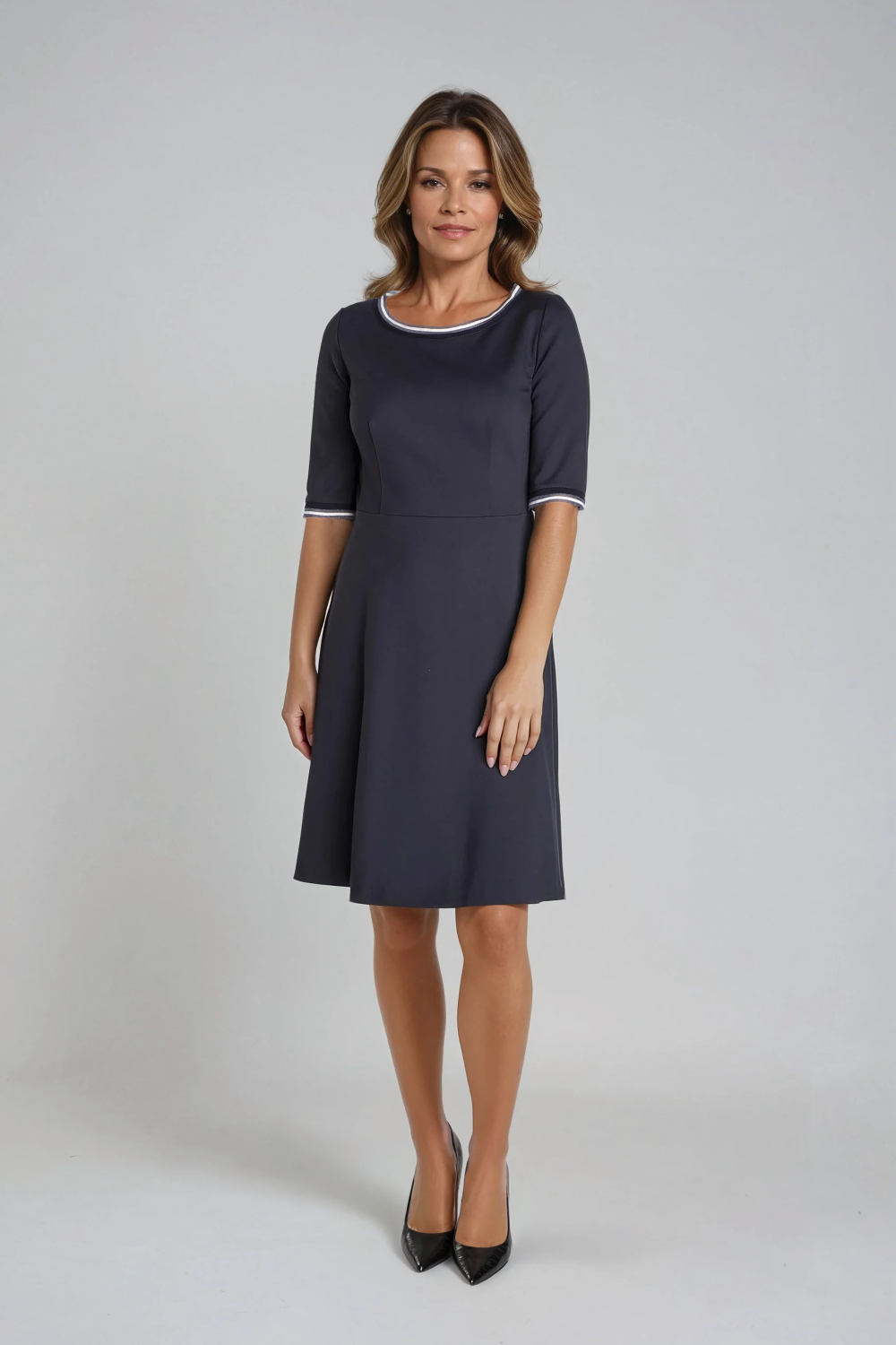 Dzianinowa sukienka w kolorze granatowym. Fason odcinany z dopasowaną górą. Dół – rozkloszowany. Zapinany w tyle na kryty zamek. Rękaw długości do łokcia. Dekolt półokrągły. Dekolt i rękawy wykończone ozdobną taśmą ściągaczową. Sukienka bez podszewki.