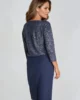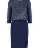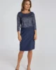 Wizytowa, granatowa sukienka z błyszczącą górą to ciekawa kreacja na wiele okazji. Idealna na imieniny, przyjęcie w gronie znajomych lub świąteczne spotkanie. Noś ją ze srebrnymi dodatkami.
