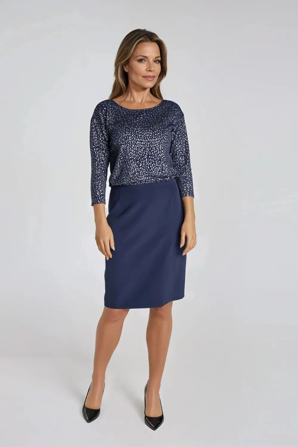 Wygodna sukienka na wiele okazji. Miękka, elastyczna dzianina z elastanem zapewnia komfort. Pasuje do granatów, srebra, czerni i czerwieni. Luźna, błyszcząca góra przyciągająca uwagę i jednokolorowy, wyszczuplający dół.