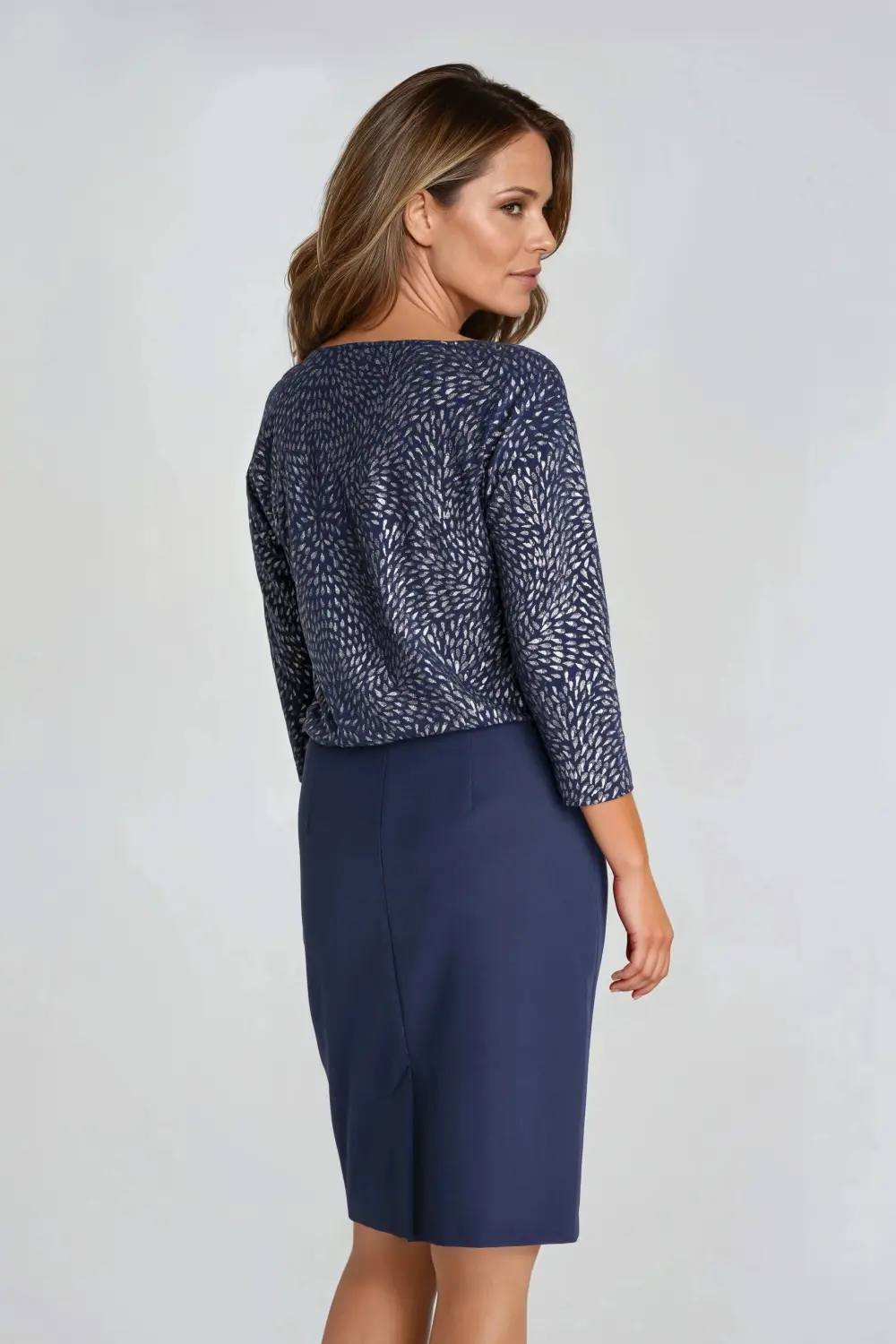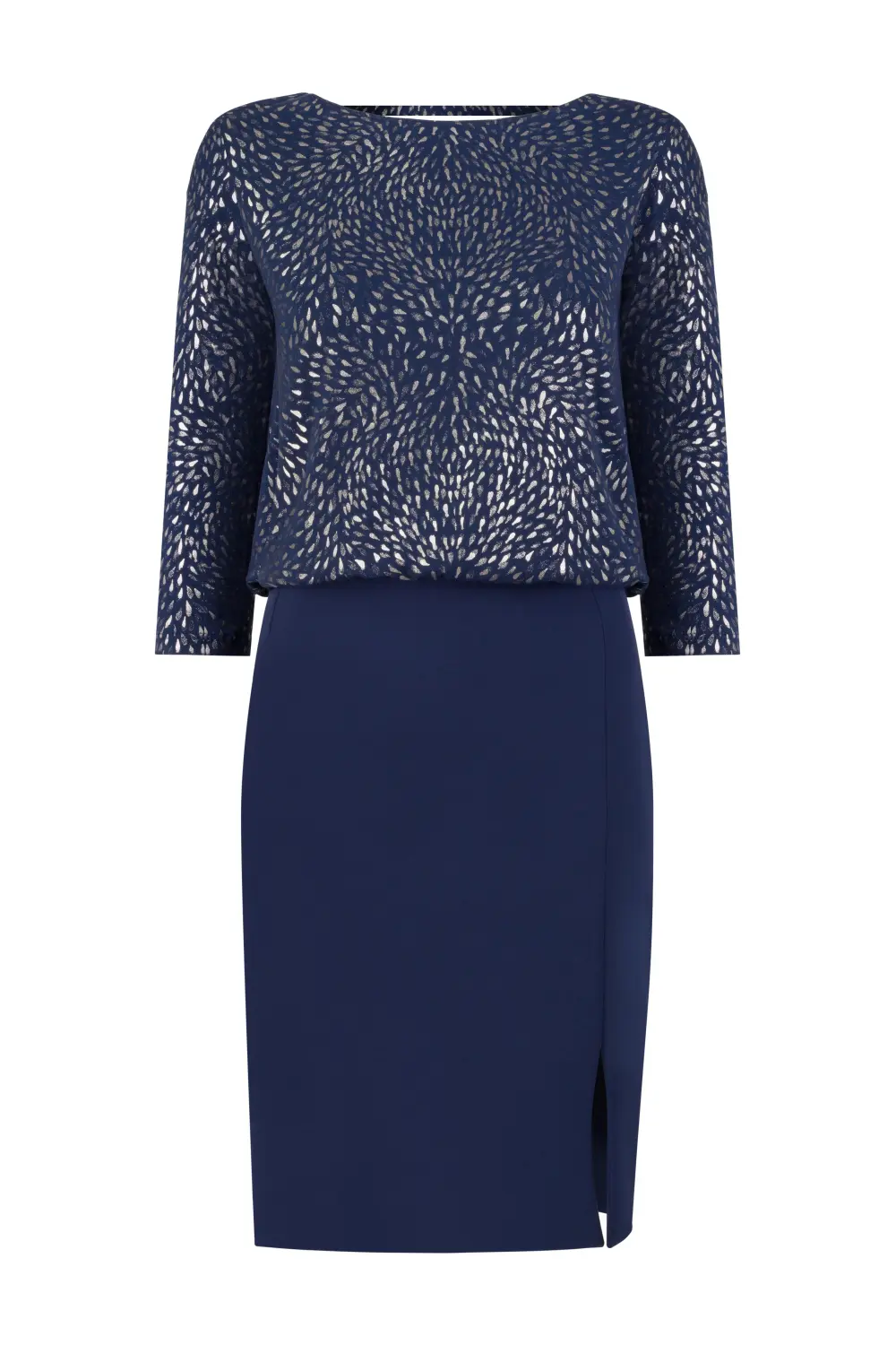 Luźna, wyrzucana góra z dekoltem w łódkę i wąskim rękawem. Dół – z tkaniny kontrastowej, zawężany. Tył z krytym rozporkiem. Zapięcie na zamek z boku spódnicy. Nad zamkiem pęknięcie, które sprawia, że wyrzucana góra lepiej się układa. Bez podszewki.