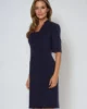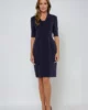 Granatowa sukienka ołówkowa z rękawem z ozdobnymi wycięciami dekoltu i cięciami przodu to oryginalna sukienka do pracy. Liczne cięcia, wycięcia i panele sprawiają, że prosty fason nabrał nowoczesnego sznytu. Dopasowana sukienka w kolorze niebieskim to model w sam raz do pracy.