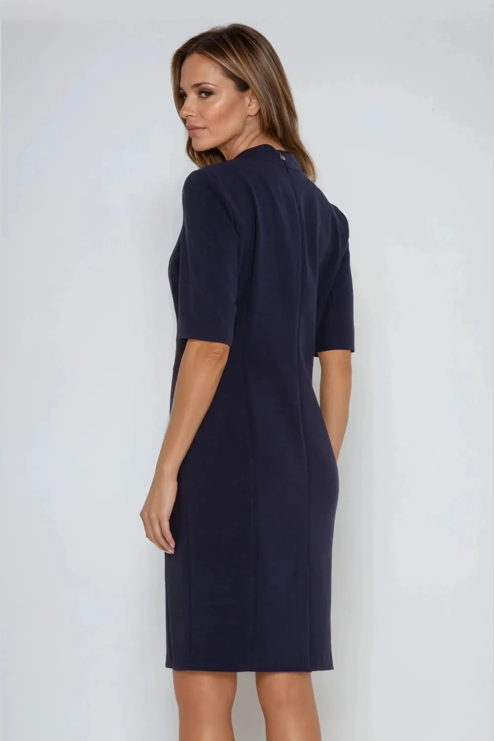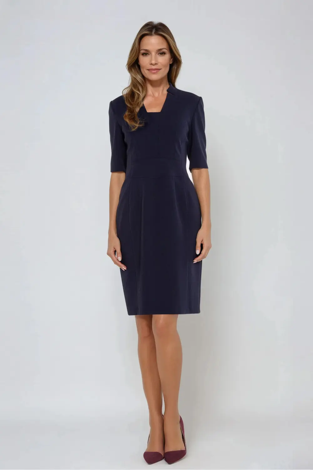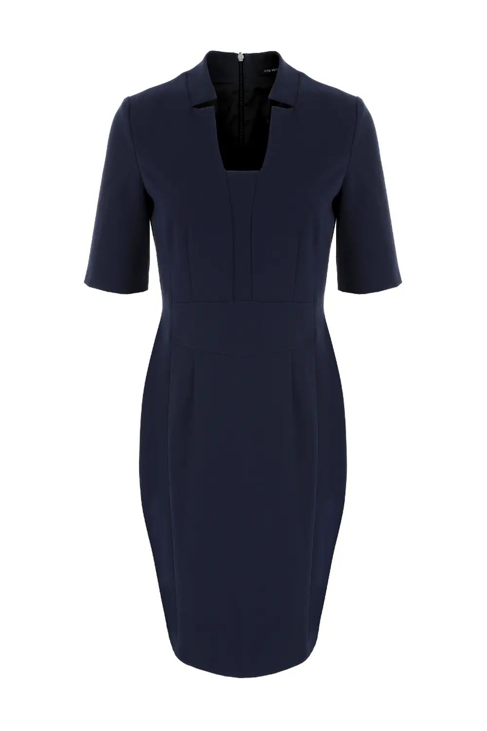 Granatowa sukienka ołówkowa z rękawem z ozdobnymi wycięciami dekoltu i cięciami przodu to oryginalna sukienka do pracy. Liczne cięcia, wycięcia i panele sprawiają, że prosty fason nabrał nowoczesnego sznytu. Dopasowana sukienka w kolorze niebieskim to model w sam raz do pracy.