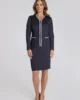 Wygodny, granatowy żakiet dzianinowy na różne okazje. Pasuje do pracy, na weekend, jak i na niezobowiązujące spotkanie. Ceniony za wygodę. Wpisuje się w styl sportowej elegancji. Pudełkowy żakiet na suwak uszyty z wiskozowej dzianiny z lekkim połyskiem ozdobiliśmy dekoracyjnie pomarszczoną taśmą. Można go nosić na bluzkę lub topik albo zapięty. W kolekcji mamy sukienki, spodnie i spódnicę z tej samej dzianiny, byś mogła tworzyć różne stylizacje z dzianinowym żakietem na wiosnę 2025.