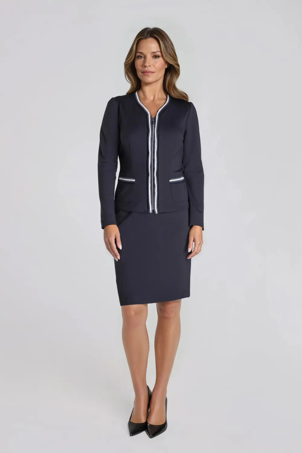 Wygodny, granatowy żakiet dzianinowy na różne okazje. Pasuje do pracy, na weekend, jak i na niezobowiązujące spotkanie. Ceniony za wygodę. Wpisuje się w styl sportowej elegancji. Pudełkowy żakiet na suwak uszyty z wiskozowej dzianiny z lekkim połyskiem ozdobiliśmy dekoracyjnie pomarszczoną taśmą. Można go nosić na bluzkę lub topik albo zapięty. W kolekcji mamy sukienki, spodnie i spódnicę z tej samej dzianiny, byś mogła tworzyć różne stylizacje z dzianinowym żakietem na wiosnę 2025.