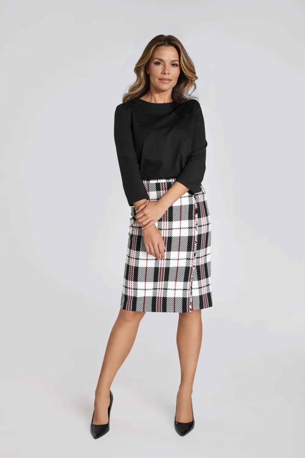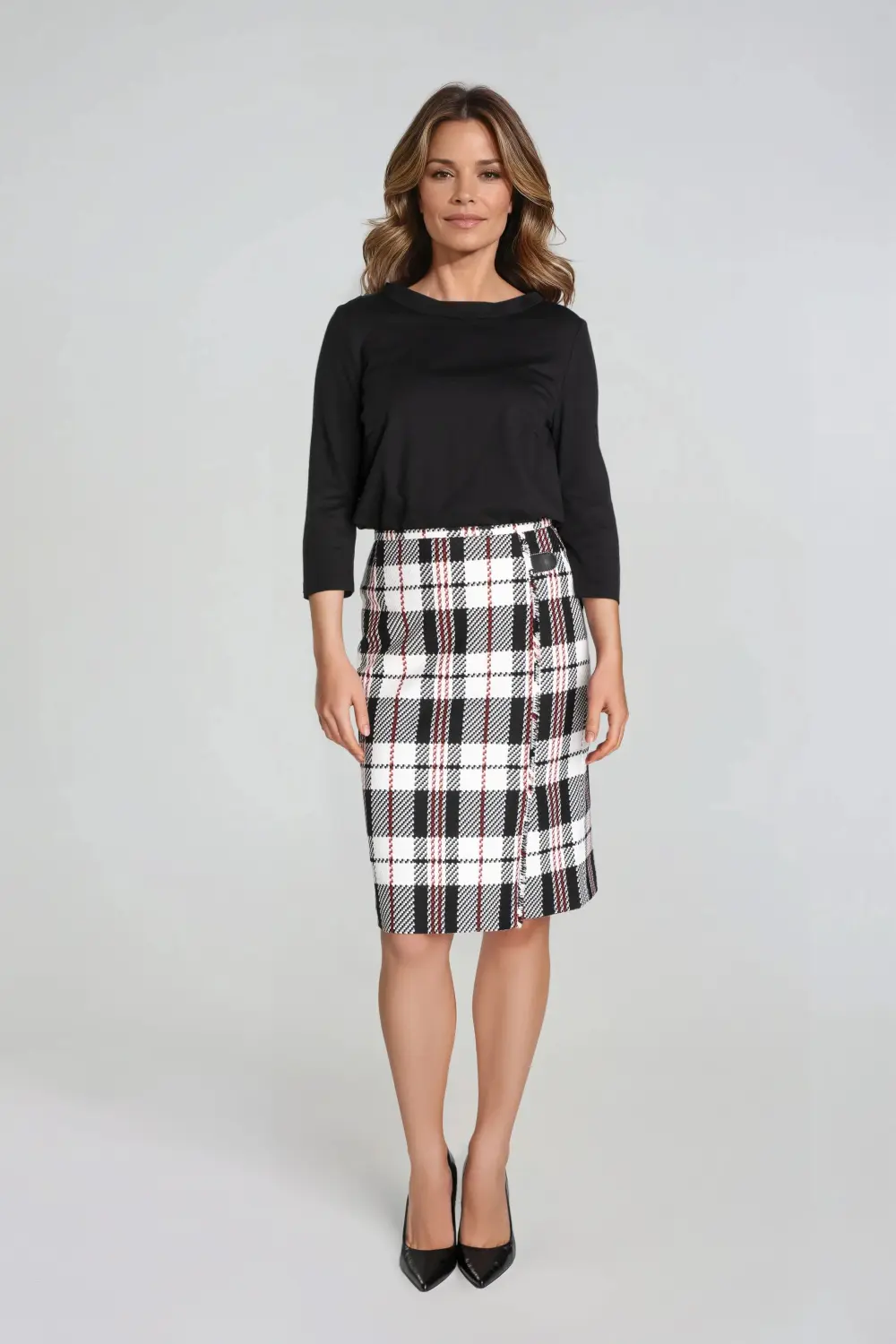 Jeśli tak, jak my nie wyobrażasz sobie szafy bez wzorów to spodoba Ci się nasza spódnica w kratkę. Modna spódniczka ołówkowa we wzór tartan w ponadczasowym zestawieniu kolorystycznym – bieli, czerni z czerwienią. Idealna do zimowej stylizacji z kozakami i krótkim futerkiem, ale nie tylko. Jeśli jesteś fanką tego ponadczasowego wzoru to możesz ją nosić też wiosną i jesienią. Ołówkowa spódnica w kratę pasuje do zestawów do pracy, jak i na świąteczne spotkania. Nasza stylistka radzi, by przełamać ją gładką górą. jak biała koszula, czarny golf, czy bluza ze stójką. Możesz też założyć białą koszulkę i czerwony żakiet. Pasuje do szpilek, skórzanych botków, czy trampek. Chcesz obejrzeć inne spódnice w kratę? Zajrzyj na nasz profil na Instagramie i do naszego sklepu internetowego. W kolekcji znajdziesz inne spódnice 2025 w małych i dużych rozmiarach oraz spódnice kratę.