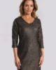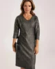 Sukienka w złoty wzór sprawdzi się na co dzień, jak i na nieco bardziej eleganckie okazje. Prosty fason z wyszczuplającym dekoltem w serek i lekko dopasowanym dołem. Uszyta z tkaniny w złoty nadruk. Idealna dla fanek lekko błyszczących, nieprzesadnych sukienek. Jeśli szukasz sukienki, która będzie wizytowa, ale stonowana, to właśnie ona. Klasyczny krój, lekki połysk i geometryczny nadruk.