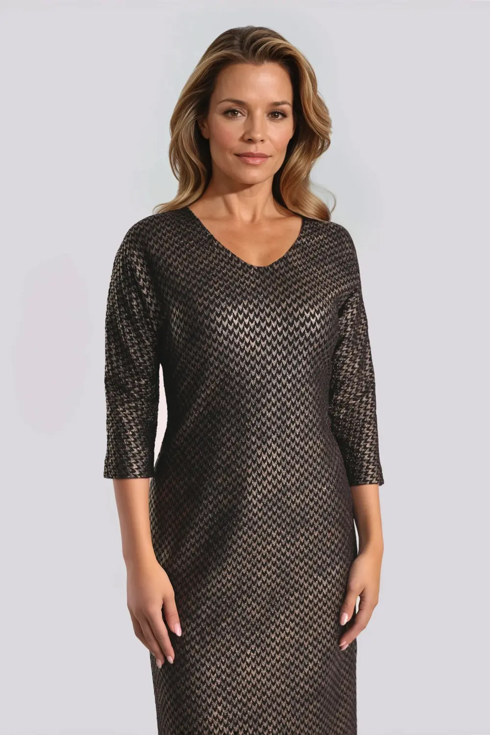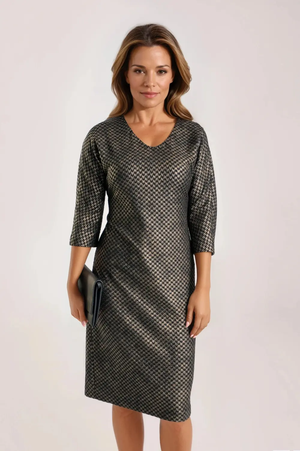 Sukienka w złoty wzór sprawdzi się na co dzień, jak i na nieco bardziej eleganckie okazje. Prosty fason z wyszczuplającym dekoltem w serek i lekko dopasowanym dołem. Uszyta z tkaniny w złoty nadruk. Idealna dla fanek lekko błyszczących, nieprzesadnych sukienek. Jeśli szukasz sukienki, która będzie wizytowa, ale stonowana, to właśnie ona. Klasyczny krój, lekki połysk i geometryczny nadruk.