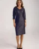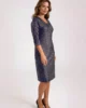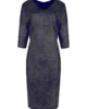 Granatowa sukienka wizytowa w złoty wzór. Luźny fason z kimonowym rękawem i opuszczoną linią ramienia. Wyszczuplający dekolt w szpic. W kolekcji również sukienka czarna.