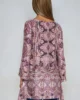 Rozkloszowana, wzorzysta tunika damska z dekoltem w serek. Tunika o formie lekko pasowanej z długimi, lekko rozkloszowanymi rękawami. Półokrągły dekolt z sznurowanym wycięciem V. Przy dekolcie sznureczki z metalowymi końcówkami. Uszyta z wiskozy z domieszką jedwabiu.